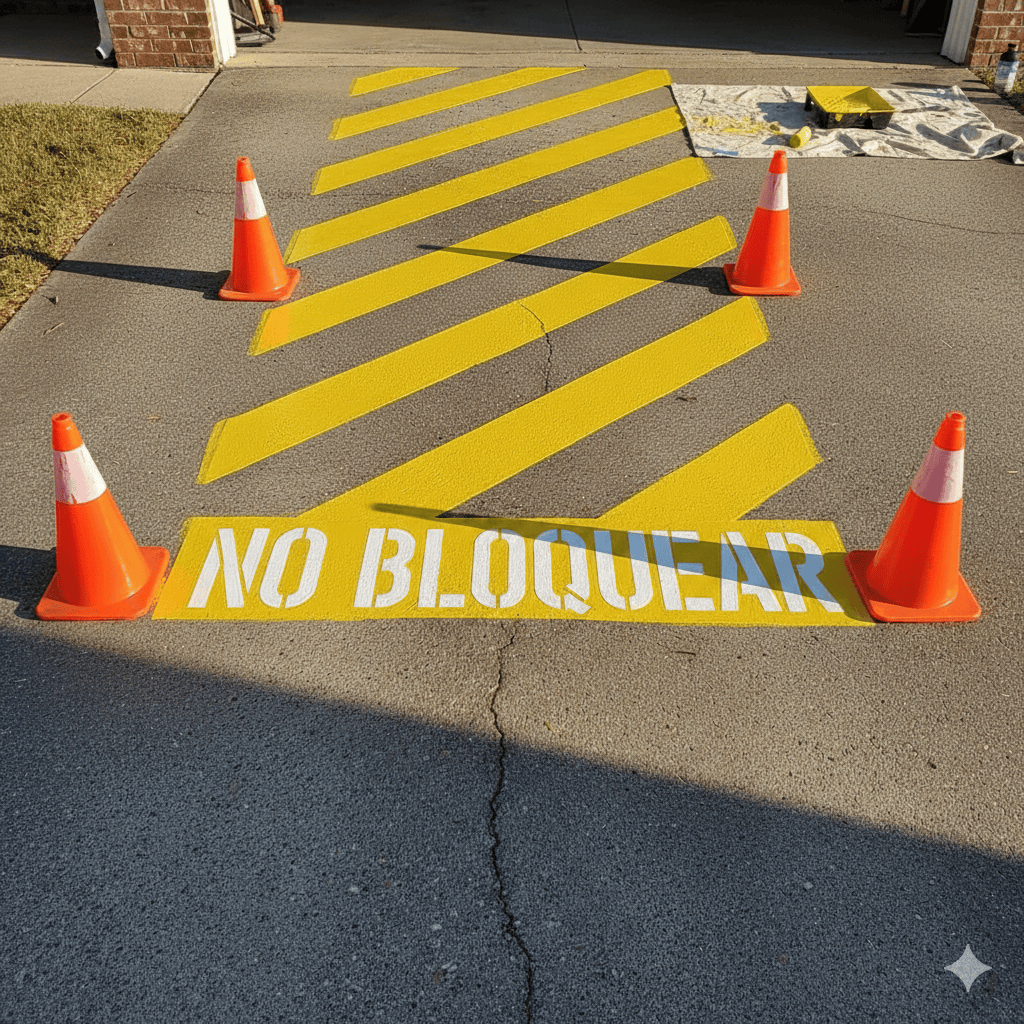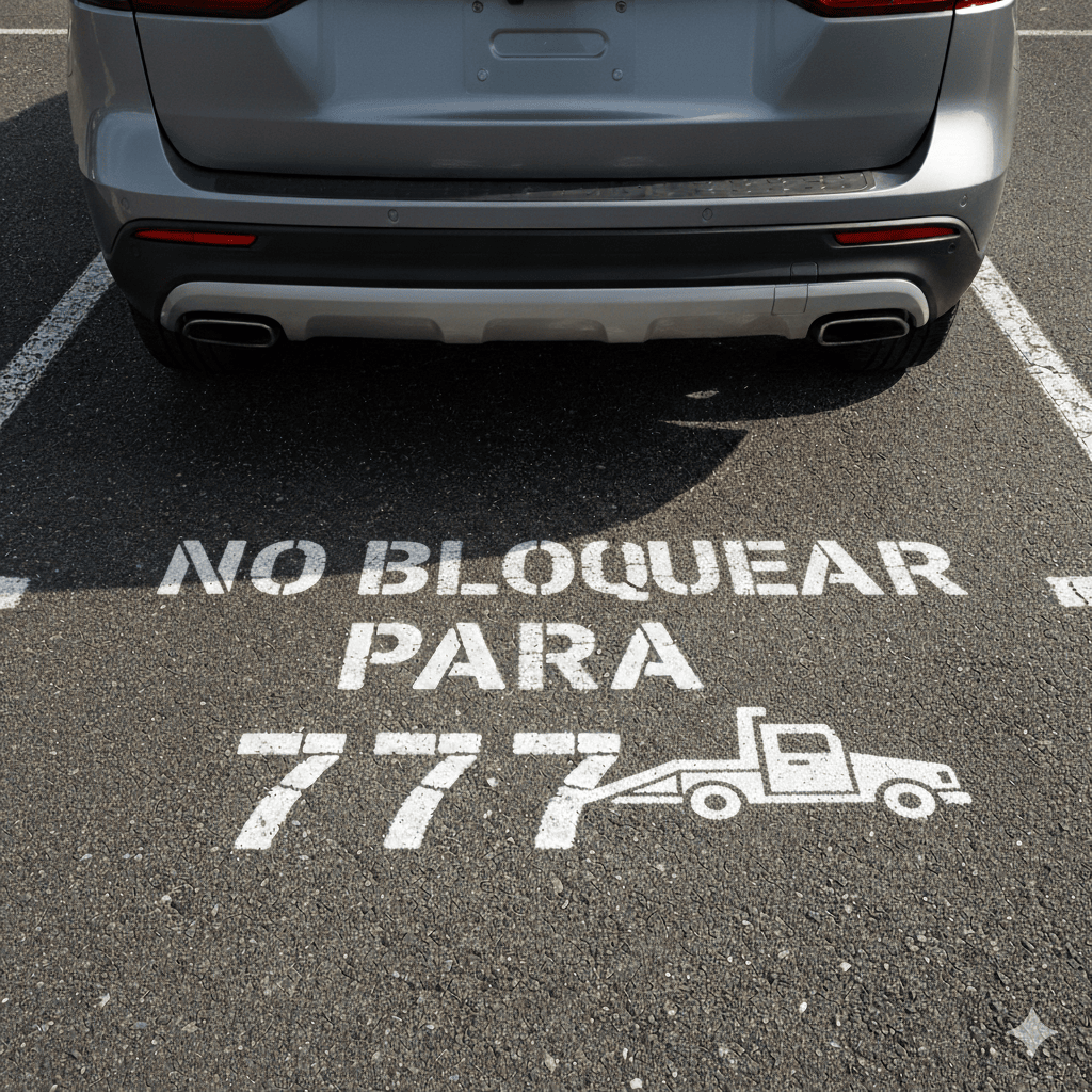 El cerebro humano respeta los símbolos de autoridad. Estarcimos en el pavimento el icono de GRÚA y la leyenda "NO BLOQUEAR" con tipografía industrial. Instalamos señalética metálica oficial en tu portón.